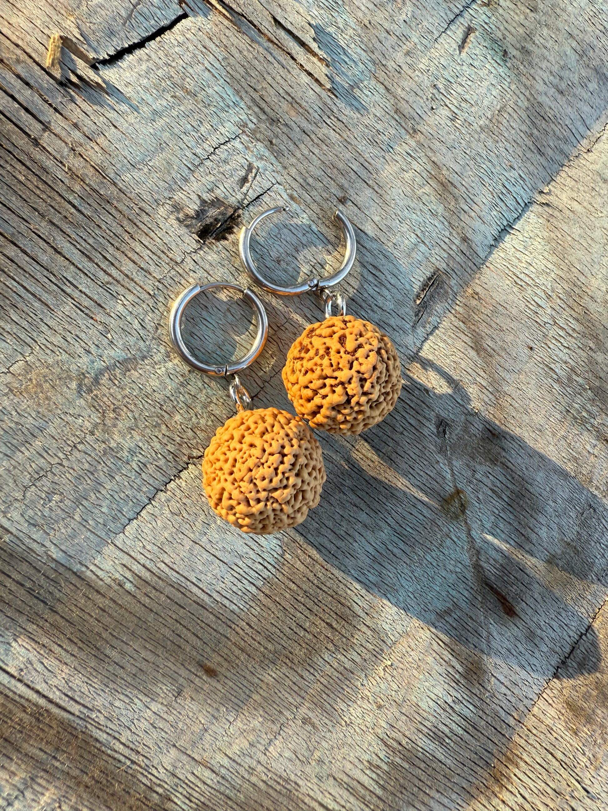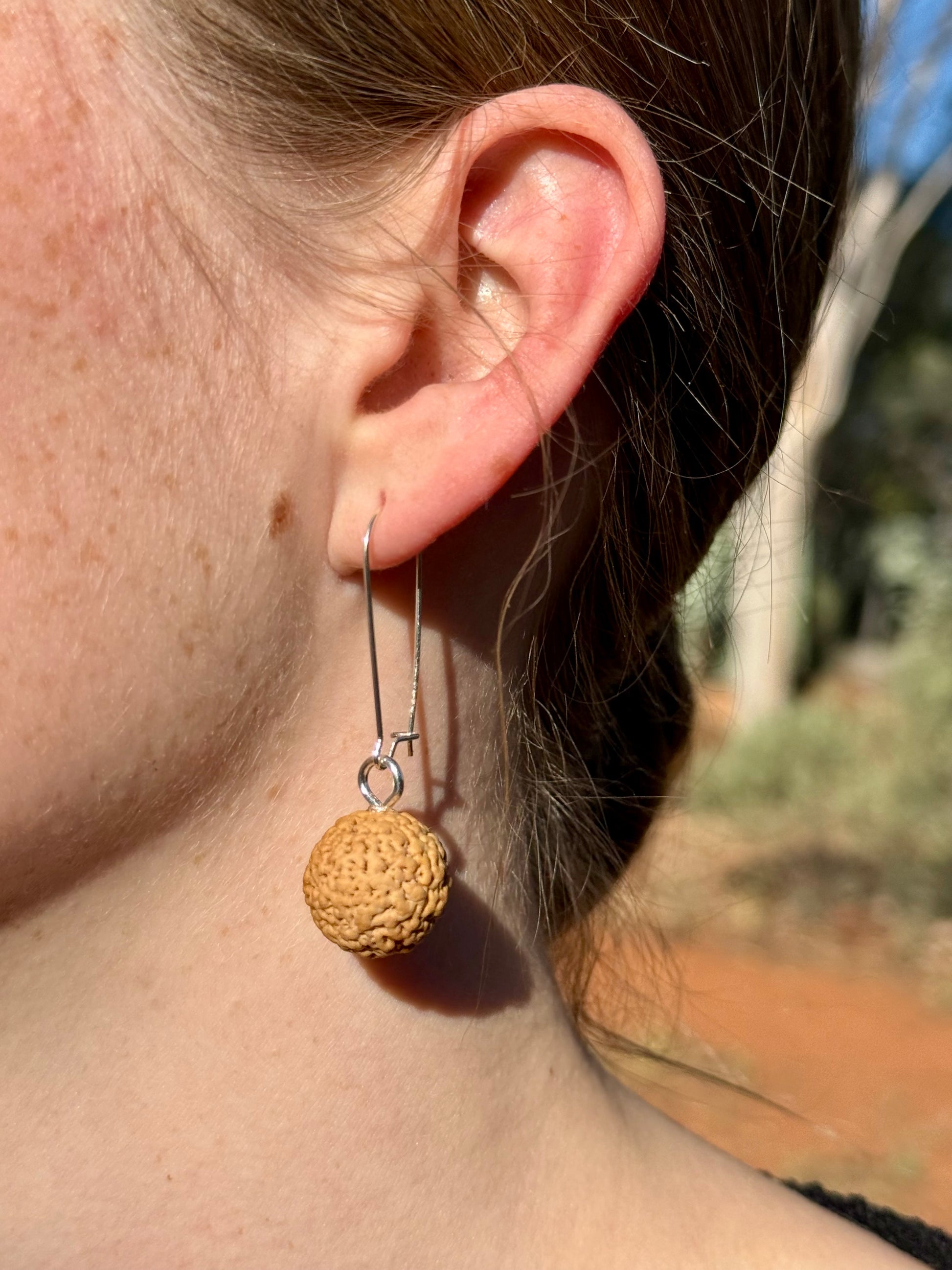 The Quandong tree, also known as Wild Peach (Santalum acuminatum) is one of the many natives that grows on my property in Central Australia. After peeling the fruit to reveal the unique seeds, I transform them into these earthy, one-of-a-kind earrings. Set on Stainless Steel huggie hoops or Sterling Silver 925 hooks, each handmade pair celebrates the beauty of the desert.